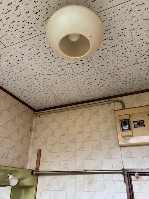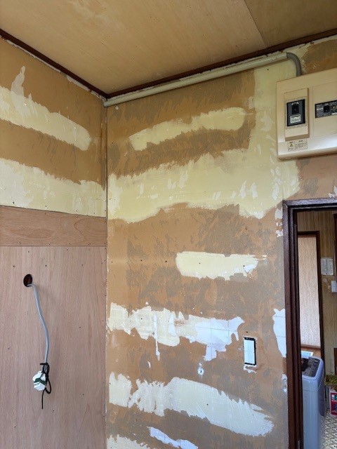 壁の古いクロスを剥がし、新しい洗面台設置用にベニヤ板を下地に入れ、電源も確保します。