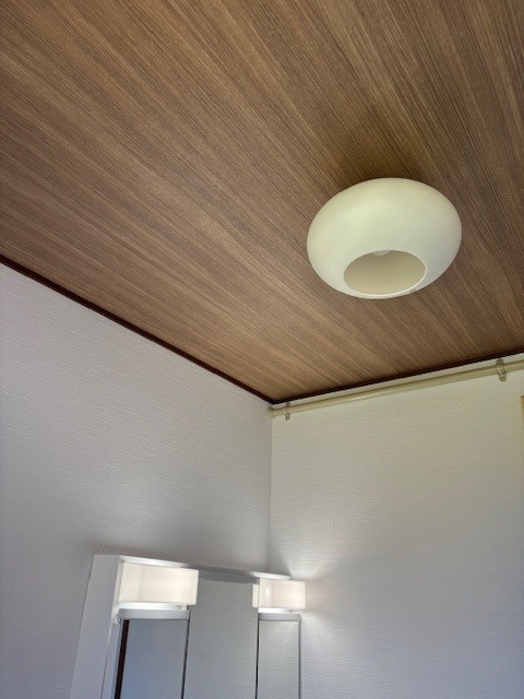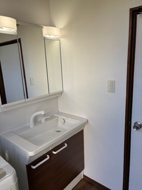 洗面化粧台はTOTO製の三面鏡タイプで壁、天井をクロス仕上げです。